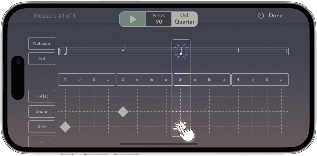 For instance, students creating their first beat might simply tap inside a rhythmic grid similar to a drum machine, not only hearing the results immediately, but also seeing how it displays on the staff — learning notation through discovery rather than memorization.