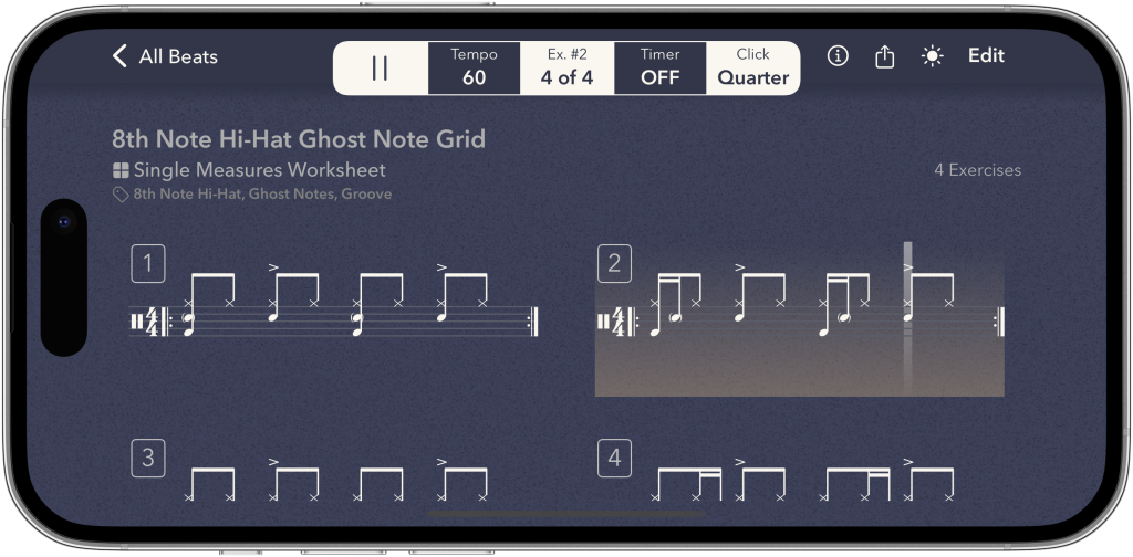 A basic rock beat instantly becomes a Latin groove, a ghost-note study, or a limb independence exercise with simple parameter changes.