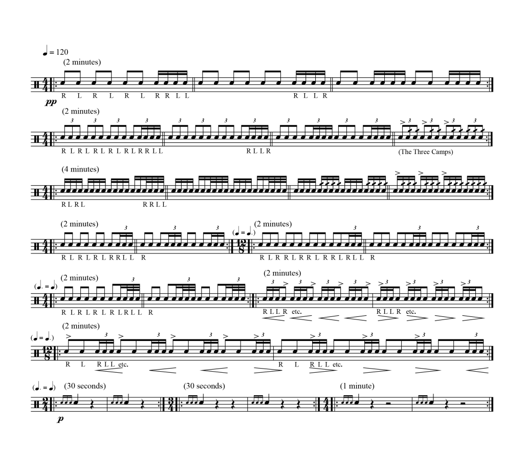 Position a full-length mirror where you have a full view of your hand and upper body. Place the music low enough to allow full visibility of your instrument. Turn on your metronome to the desired tempo and start your stopwatch. Timing out each pattern is especially helpful in that it eliminates the need to count repetitions, leaving more headspace to focus on what you are seeing, feeling, and hearing as you play. In this case, the first six patterns on the page can be somewhat improvisatory. Twenty minutes later, your soft snare drum ornament will be better, and you’ve gotten in your soft snare drum work for the day.